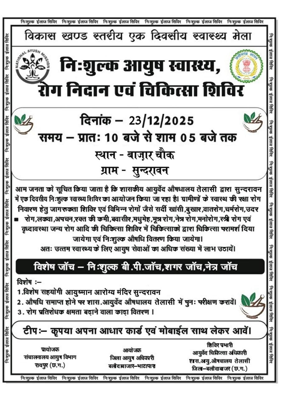 PALARI आयुष विभाग जिला-बलौदाबाजार द्वारा 23 दिसंबर 2025 को सुबह 10 बजे से शाम 5 बजे तक बाज़ार चौक ,ग्राम सुन्द्रावन ( विकास खंड – पलारी ) में एक दिवसीय नि:शुल्क स्वास्थ्य शिविर का आयोजन किया गया है। शिविर प्रभारी डॉ. तारिका ठाकुर ( आयुर्वेद चिकित्सा अधिकारी ) ने बताया कि स्वास्थ्य शिविर में आयुर्वेद एवम् होम्योपैथी विशेषज्ञ चिकित्सकों द्वारा चिकित्सा उपचार कर नि:शुल्क औषधियों का वितरण किया जाएगा। साथ ही शिविर में उपस्थित अधिकारी-कर्मचारियों द्वारा जनमानस का प्रकृति परीक्षण एवं रोग प्रतिरोधक काढ़ा वितरण भी किया जाएगा। शिविर में लैब टेक्निशियन (LAB TECHNICIAN) भी उपस्थित रहेंगे जिनके द्वारा शिविर में आये मरीजों की निःशुल्क (B.P.) एवम शुगर की जांच की जाएगी ।उन्होंने शहर के नागरिकों से आयोजित नि:शुल्क शिविर में अधिक से अधिक संख्या में उपस्थित होकर स्वास्थ्य शिविर का लाभ उठानके की अपील की है।