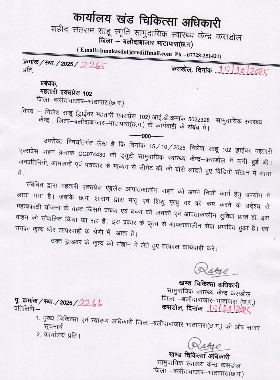 कसडोल। विकासखंड मुख्यालय कसडोल में शासन की जीवनदायनी कही जाने वाली महतारी एक्सप्रेस 102 पर वाहन के चालक नीलेश साहू द्वारा अपने साथी के साथ सीमेंट सप्लाई करते नजर आ रहे हैं, जिसका वीडियो सोशल मीडिया पर तेजी से वायरल हो रहा है, और स्वास्थ्य विभाग के जिम्मेदारों पर सवाल खड़ा कर रहा है, आपको बता दे कि महतारी एक्सप्रेस 102 द्वारा गर्भवती महिलाओं को घर से अस्पताल तक लेकर जाने का काम करती है, जिससे गर्भवती महिलाओं को सुविधाएं हो जिससे ग्रामीण इस वाहन को जीवनदायिनी कहते है, लेकिन कुछ लोग नियमों का उल्लंघन करते हुए इन्हीं शासकीय वाहनों पर सीमेंट सप्लाई कर रहे हैं। यह वीडियो अभी कहां का है यह स्पष्ट नहीं हो पाया है, लेकिन सूत्रों का कहना है कि यह वीडियो कसडोल क्षेत्र का बताया जा रहा है, हालांकि जब इस मामले में बीएमओ कसडोल डॉ रविशंकर अजगळे से जानकारी लिया गया तो उन्होंने ने बताया कि नीलेश साहू नामक चालक को सस्पेंड कर दिया गया है, साथ ही इन्हें डिस्ट्रिक्ट मैनेजर द्वारा नोटिस जारी किया गया है। फिलहाल अब यह सवाल खड़े हो रहें है कि उक्त वाहन के चालक किसके संरक्षण पर सीमेंट की ढुलाई कर रहा था या इसके अलावा अन्य सामानो की ढुलाई निरन्तर की जा रही है, बहरहाल यह तो जांच में क्लियर हो जायेगा।