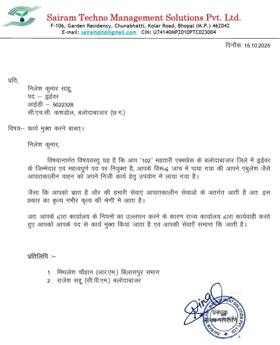 महतारी एक्सप्रेस में सीमेंट सप्लाई करते दिखे 102 के कर्मचारी, बीएमओ ने किया सस्पेंड, नोटिस जारी