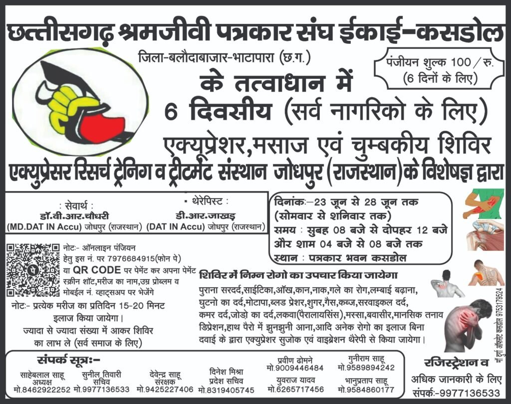 KASDOL NEWS छत्तीसगढ़ श्रमजीवी पत्रकार संघ ईकाई-कसडोल के तत्वाधान में 23 जून सोमवार से 28 जून शनिवार तक 6 दिवसीय स्वास्थ्य शिविर का आयोजन होगा। इस शिविर में एक्यूप्रेशर,मसाज एवं चुम्बकीय शिविर एक्युप्रेसर रिसर्च ट्रेनिग व ट्रीटमेंट संस्थान जोधपुर (राजस्थान) के विशेषज्ञ द्वारा किया जाएगा।जिसका ऑनलाइन पंजीयन शुल्क 100/रु. (6 दिनों के लिए) निर्धारित है। इस शिविर में सेवार्थ डॉ.वी.आर.चौधरी (MD.DAT IN Accu) जोधपुर (राजस्थान)व थेरेपिस्ट