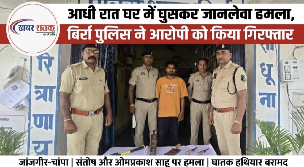 जांजगीर-चांपा। बिर्रा थाना क्षेत्र में एक सनसनीखेज मामला सामने आया है, जहां आधी रात घर में घुसकर दो लोगों पर जानलेवा हमला करने वाले आरोपी को पुलिस ने त्वरित कार्रवाई करते हुए गिरफ्तार कर लिया है।