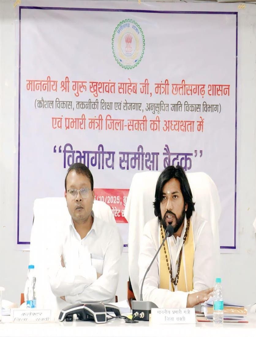 सक्ती। सक्ती जिला के प्रभारी मंत्री गुरु खुशवंत साहेब की अध्यक्षता में मंगलवार को जिला कार्यालय सभागार में पहली समीक्षा बैठक आयोजित की गई। बैठक में विभागवार योजनाओं, राजस्व प्रकरणों, लोकसेवा गारंटी एवं विकास कार्यों की विस्तृत समीक्षा की गई। बैठक के दौरान मंत्री जी ने विभागीय कार्यों की धीमी गति और लापरवाही पर नाराज़गी व्यक्त की।