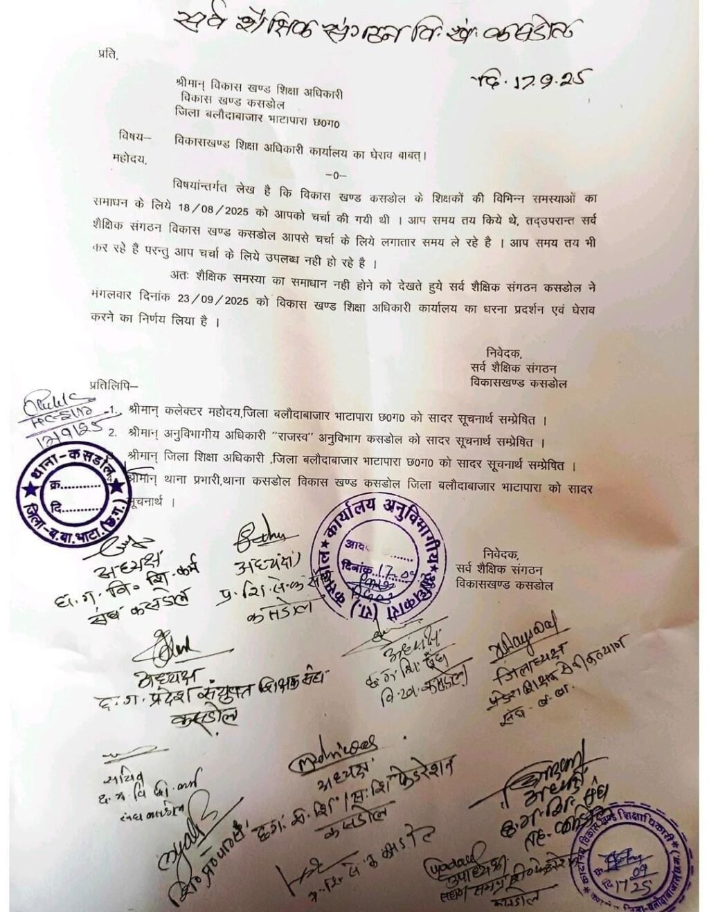 आप समय तय भी कर रहे हैं परन्तु आप चर्चा के लिये उपलब्ध नहीं हो रहे है। शैक्षिक समस्या का समाधान नहीं होने को देखते हुये सर्व शैक्षिक संगठन कसडोल मंगलवार दिनांक 23/09/2025 को विकास खण्ड शिक्षा अधिकारी कार्यालय का धरना प्रदर्शन एवं घेराव करने का निर्णय लिया है। जानकारी के मुताबिक बड़े स्तर पर यह घेराव होने वाला है संघटन के लोग अपनी समस्या को लेकर 23 सितंबर को विकासखंड शिक्षा अधिकारी कार्यालय का घेराव करेंगे।