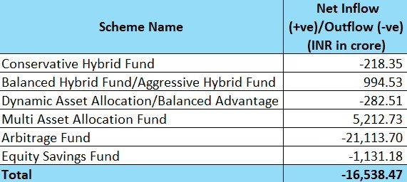 हाइब्रिड फंड्स में मार्च में 16,538 करोड़ रुपये का आउटफ्लो/निकासी दर्ज किया गया,जबकि फरवरी में 11,983 करोड़ रुपये का निवेश हुआ था। मार्च 2025 में, इस कैटेगरी में 946 करोड़ रुपये का मामूली आउटफ्लो देखा गया था।