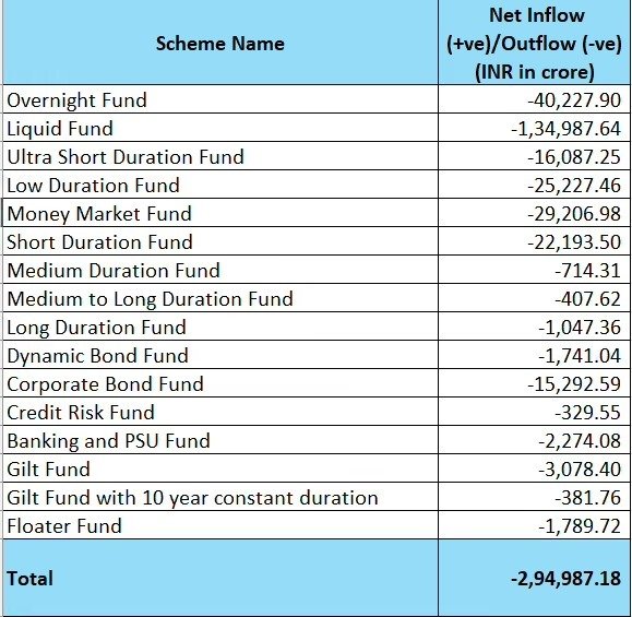 डेट म्यूचुअल फंड्स में मार्च में 2.94 लाख करोड़ रुपये का निकासी देखा गया, जबकि फरवरी में 42,106 करोड़ रुपये का निवेश हुआ था। पिछले साल मार्च में, इन फंड्स में 2.02 लाख करोड़ रुपये का आउटफ्लो/निकासी दर्ज किया गया था।