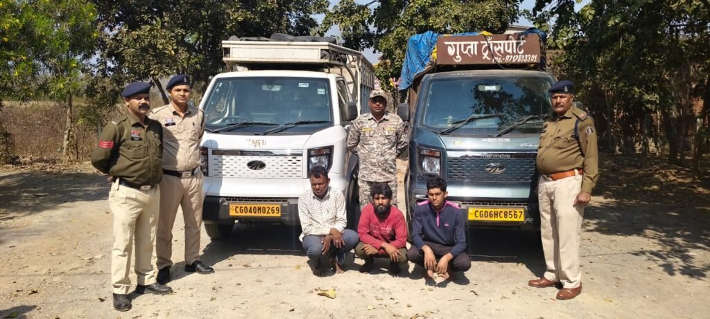 विवरण- मामले का सक्षिप्त विवरण इस प्रकार हैं कि दिनाक 26/02/2026 को सूचना मिला कि दो नग वाहन 01. महेन्द्रा वीरो स्लेटी कलर का क्रमांक CG 06-HC-8567, 02. महेन्द्रा वीरो सफेद रंग का क्रमांक CG 04-QM-0269 में भैंस एवं भैंसा मवेशी को क्रुरता पूर्वक भरकर बिलाईगढ तरफ से उडीसा ले जा रहे है कि सूचना पर थाना प्रभारी पुरेन्द्र मल्होत्रा के हमराह सउनि.देवनारायण साहू आरक्षक 68,388,283,254,271 के घेराबंदी कर वाहन 01. महेन्द्रा वीरो स्लेटी कलर क्रमांक CG 06-HC-8567, 02. महेन्द्रा वीरो सफेद रंग क्रमांक CG 04-QM-0269 को पकड़ने से महेन्द्रा वीरो वाहन क्रमांक CG 06-HC-8567 में 02 नग भैंस 03 नग भैंसा तथा दुसरे वाहन महेन्द्रा वीरो क्रमांक CG 04-QM-0269 में 02 नग भैंस 03 नग भैंसा कुल 10 नग ठुस ठुस कर क्रुरता पूर्वक भरा था जिस सम्बंध में चालक सूरज गुप्ता तथा दुसरे वाहन के चालक भीखम सिन्हा ने भैंस भैंसा मवेशी को उडीसा राज्य ले जाना बताये जिन्हें नोटिस देने पर वाहन में मवेशी परिवहन करने के सम्बंध में वैध दस्तावेज नहीं होना लिखित में दिये मौके पर देहाती नालसी लिया गया वाहन चालको सूरज गुप्ता, भीखम सिन्हा एवं केबिन में बैठे कबीर खान का मेमोरेंण्डम कथन लेकर वाहन महेन्द्रा वीरो क्रमांक सी जी 06-एच सी-8567 एवं महेन्द्रा वीरो क्रमांक सीजी 04-क्यु एम-0269 में 05-05 नग भैंस, भैंसा मवेशी भरे किमती 1730000/रूपये तथा 04 नग मोबाईल फोन किमती 16300/रूपये जुमला किमती 1746300/रूपये को सूरज गुप्ता, भीखम सिन्हा, कबीर खान से जप्ती किया गया। आरोपीयों के द्वारा अपराध धारा 4,6,10 छ.ग. कृषिक पशु परिरक्षण अधिनियम 2004, पशुओं के प्रति क्रुरता का निवारण अधिनियम 1960 की धारा 11(घ) का अपराध घटित करना पाये जाने से आरोपीयों के विरूध्द अपराध पंजीबध्द कर विवेचना में लिया गया। दौरान विवेचना 01- सूरज गुप्ता पिता भगवान प्रसाद गुप्ता उम्र 42 साल साकिन कोमाखान सुवरमाल थाना कोमाखान जिला महासमुंद 02. भीखम सिन्हा पिता पुरूषोत्तम सिन्हा उम्र 25 साल साकिन बिहाझर थाना बागबहरा जिला महासमुंद 03. कबीर खान पिता रहीस खान उम्र 25 साल साकिन सागंज अर्जुन नगर चौराहा थाना सागंज जिला आगरा उत्तरप्रदेश हाल मुकाम ट्रांसपोर्ट नगर पार्किंग नं 04 चांद होटल के पास थाना बंजारी जिला रायपुर छ.ग. से पुछताछ कर मेमोरण्डम कथन लिया गया जो अपराध घटित करना स्वीकार करने पर आज दिनांक 26/02/26 को गिरप्तार कर गिरफतारी की सुचना उसके परिजन को देकर माननीय जेएमएफसी न्यायालय बिलाईगढ़ पेश कर रिमाण्ड पर भेजा गया है। जिसमें अन्य आरोपी की संलिप्तता होने की संभावना है।
