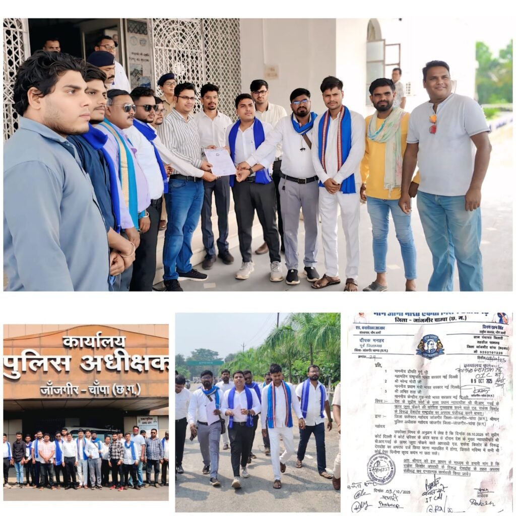 भीम आर्मी जांजगीर चांपा ने बीआर गवई के साथ गलत व्यवहार को लेकर दोषी को देशद्रोही का अपराध दर्ज करने की मांग को लेकर सौंपा ज्ञापन