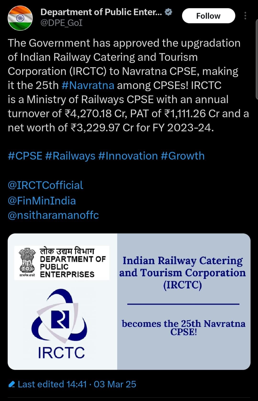 विभाग ने अपने पोस्ट में कहा, “आईआरसीटीसी रेल मंत्रालय का एक सीपीएसई है, जिसका वार्षिक कारोबार 4,270.18 करोड़ रुपये, और टैक्स के बाद प्रॉफिट 1,111.26 करोड़ रुपये और वित्त वर्ष 2023-24 के लिए 3,229.97 करोड़ रुपये का नेटवर्थ है। कुल मार्केट कैप 54,000 करोड के लगभग।