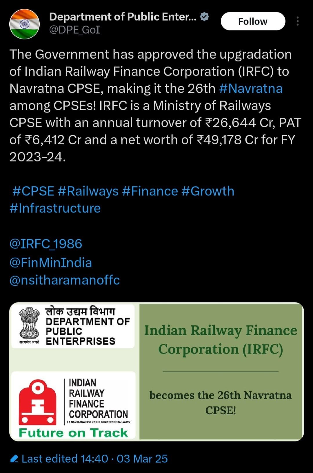 एक अन्य पोस्ट में बताया गया कि “आईआरएफसी रेल मंत्रालय का एक सीपीएसई है, जिसका वार्षिक कारोबार 26,644 करोड़ रुपये, और टैक्स के बाद प्रॉफिट 6,412 करोड़ रुपये और वित्त वर्ष 2023-24 के लिए 49,178 करोड़ रुपये का नेटवर्थ है। कुल मार्केट कैप 1,45,000 करोड के लगभग।