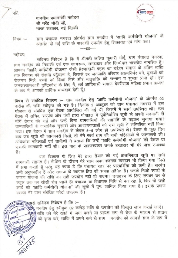 ग्राम नगरदा के मनदीप में आदि कर्मयोगी योजना से हुए कार्य की शिकायत प्रधानमंत्री से, राशि की पारदर्शिता और नियमविरुद्ध हुए उपयोग की जांच मांग