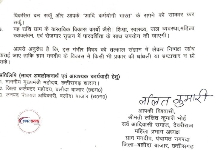 श्रीमती भोई ने मांग किया कि मनदीप हेतु स्वीकृत 02 करोड राशि के उपयोग की विस्तृत जांच कराई जाएं। साथ ही राशि को शिकायतकर्ता के खाते में जमा करने या प्रत्यक्ष रूप से चेक के माध्यम से प्रदान की कृपा करें, ताकि अपने कर्म से ग्राम गनदीप को आदर्श ग्राम के रूप मेंविकसित कर सकें और आपके “आदि कर्मयोगी भारत के सपने को साकार कर सकूँ। शासन द्वारा अगर राशि दिया गया तो यह राशि ग्राम के वास्तविक विकास कार्यों जैसे। शिक्षा, स्वास्थ्य, जल व्यवस्था, महिला स्वावलंबन, एवं रोजगार सृजन में पारदर्शिता के साथ उपयोग की जाएगी। इधर इस शिकायत पर गंभीर विषय को तत्काल संज्ञान में लेकर निष्पक्ष जांच कराने के अलावा ग्राम मनदीप के विकास में किसी भी प्रकार की धांधली या भ्रष्टाचार न हो इसकी मांग भी किया गया।