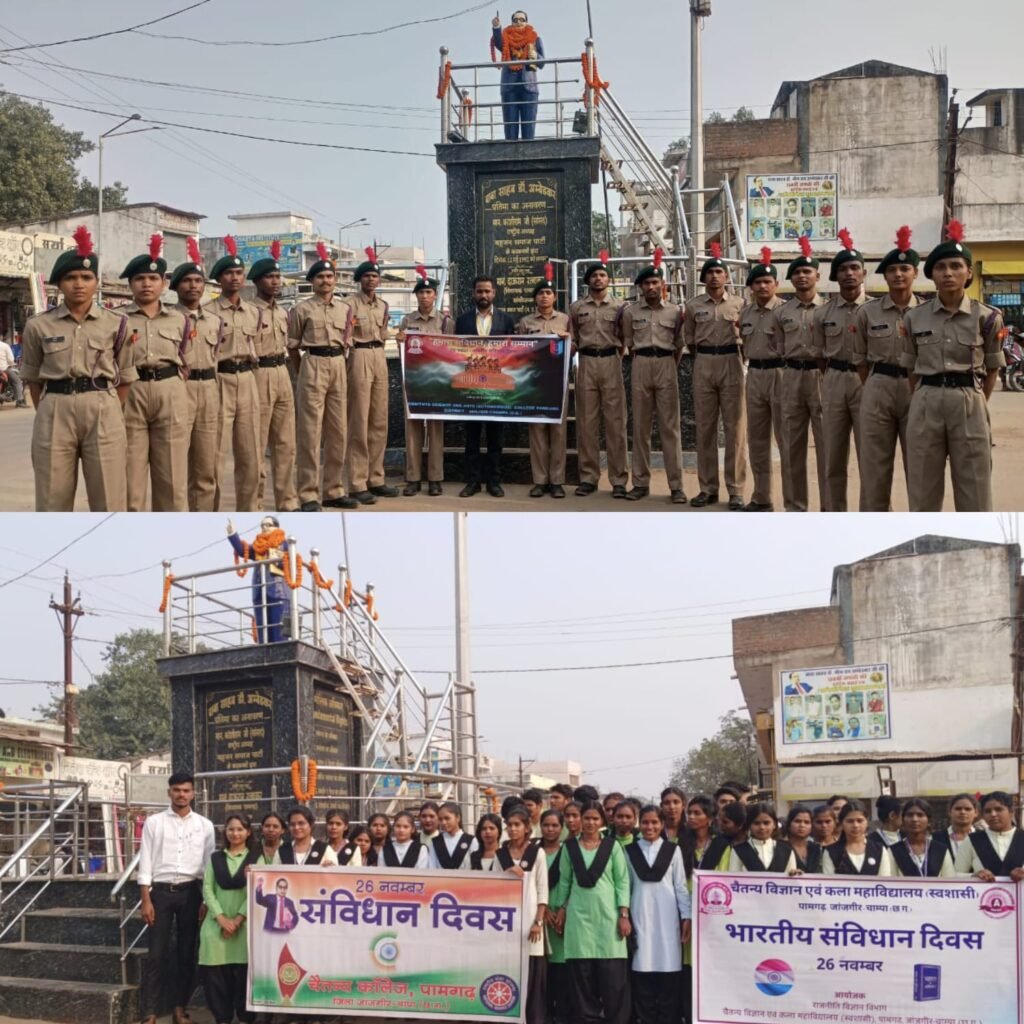पामगढ़ । चैतन्य विज्ञान एवं कला महाविद्यालय (स्वशासी) पामगढ़ में बुधवार को राजनीति शास्त्र विभाग, राष्ट्रीय सेवा योजना (एनएसएस) एवं एनसीसी के संयुक्त तत्वावधान में संविधान दिवस का आयोजन किया गया।
