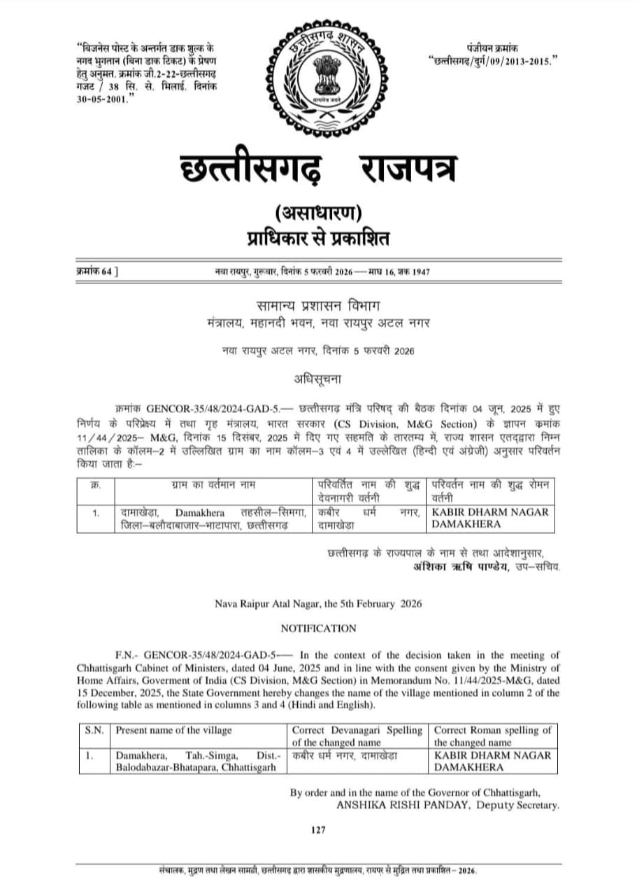 सामान्य प्रशासन विभाग द्वारा यह अधिसूचना 5 फरवरी 2026 को जारी की गई। अधिसूचना में स्पष्ट किया गया है कि यह नाम परिवर्तन सभी शासकीय अभिलेखों,दस्तावेजों और प्रशासनिक कार्यों में प्रभावी माना जाएगा।