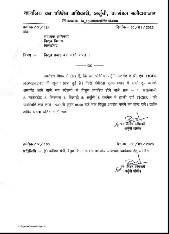 गिधौरी। बिलाईगढ़ विधानसभा क्षेत्र के सोनाखान ब्लॉक मुख्यालय के अंतर्गत बिलारी, नगेड़ा, गनियारी, करमेल, अर्जुनी, गाजर, सरायपाली, सीरमाल, बानिखार, कोहा जुनवानी आदि कई इलाकों में वन विभाग अपने मनमानी से, विगत दो रात विद्युत बंद कराने का काम कर रही है, युधिष्ठिर नायक अध्यक्ष ब्लॉक कांग्रेस कमेटी सोनाखान द्वारा विभागीय अधिकारी कर्मचारियों से चर्चा करने पर पता चला है कि, हाथी और टाइगर की सूचना के कारण विद्युत बंद कराया जा रहा है, ताकि हाथी और टाइगर को नुकसान ना पहुंचे, वन विभाग ने विद्युत विभाग को बाकायदा आदेश/फरमान जारी कर विद्युत कटौती अवरोध करने का आदेश किया है