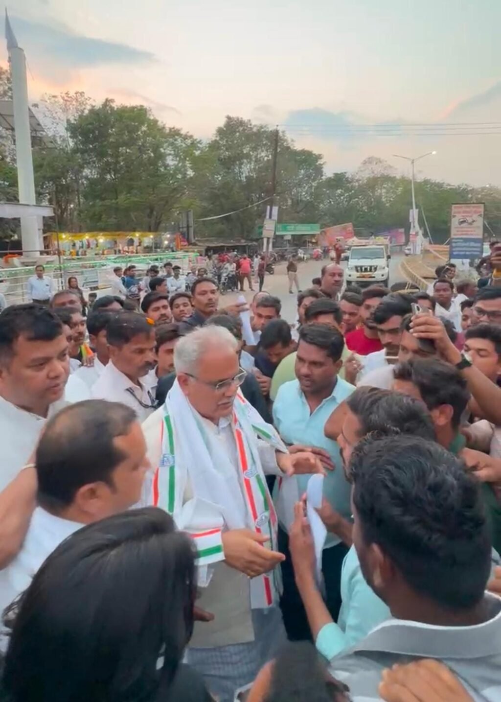 कसडोल। छत्तीसगढ़ के पूर्व मुख्यमंत्री भूपेश बघेल मंगलवार को अपने 12 से अधिक कांग्रेस विधायकों के साथ गिरौदपुरी धाम गुरुघासीदास बाबा के दर्शन करने जा रहे थे इसी दौरान कसडोल में कांग्रेस कार्यकर्ता द्वारा भव्य स्वागत किया गया। श्री बघेल ने मीडिया से चर्चा करते हुए बताया कि जो छत्तीसगढ़ में जो बजट भाजपा सरकार द्वारा पेश किया गया है, उसमें युवा, किसान और महिलाओं के लिए कुछ रोजगार नहीं है, श्री बघेल ने आगे कहा कि मौजूदा सरकार आमजनों के साथ छल कर रही है, जिसके कारण प्रदेश का विकास रुक गया है। इसके बाद श्री बघेल गिरौदपुरी दर्शन करने के लिए रवाना हो गए।