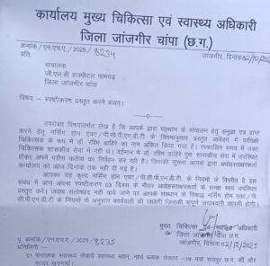 इस नोटिस की प्रतिलिपि स्वास्थ्य सेवाएं, स्वास्थ्य भवन रायपुर, कलेक्टर जांजगीर-चांपा सहित सभी संबंधित अधिकारियों को भेजी गई है, ताकि प्रकरण की निगरानी उच्च स्तर पर भी रहे।
