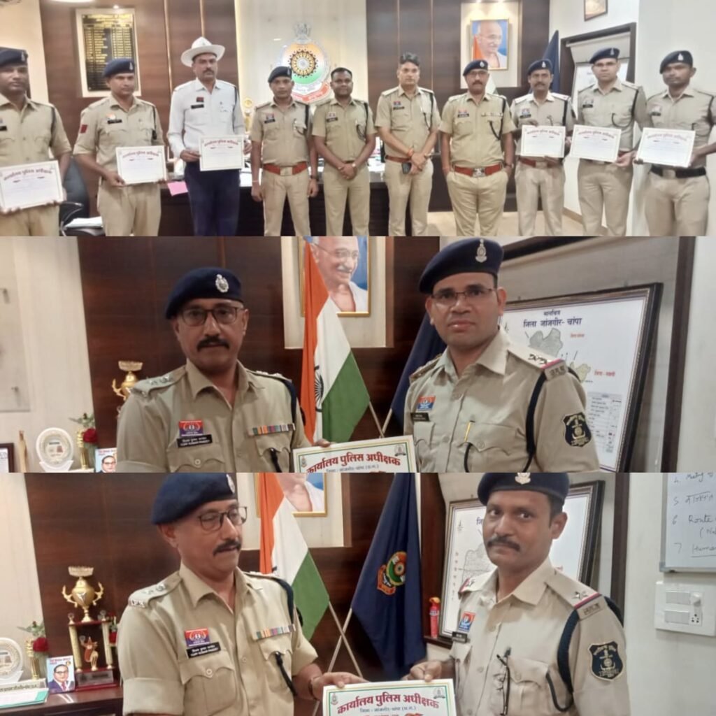 पामगढ़। जिले के उत्कृष्ट कार्य करने वाले 07 पुलिस कर्मियों को पुलिस अधीक्षक जांजगीर चांपा विजय कुमार पाण्डेय (IPS) द्वारा प्रशस्ति पत्र देकर किया गया सम्मानित. उत्कृष्ट पुलिसकर्मी पुरस्कार प्रत्येक माह की 1 तारीख को माह भर में अच्छे एवं उत्कृष्ट कार्य करने वाले पुलिस कर्मियों को दिया जाएगा। उत्कृष्ट कार्य करने वाले पुलिस कर्मियों को प्रशस्ति पत्र के साथ साथ उनकी सेवा पुस्तिका में प्रशंसा भी अंकित की गई।