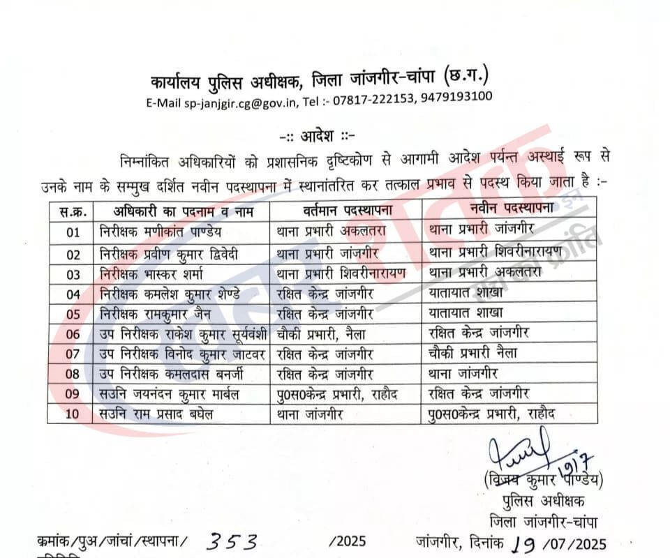 जांजगीर एसपी विजय पाण्डेय ने जिले के पांच निरीक्षक तीन उप निरीक्षक दो सहायक उप निरीक्षक का किया तबादला