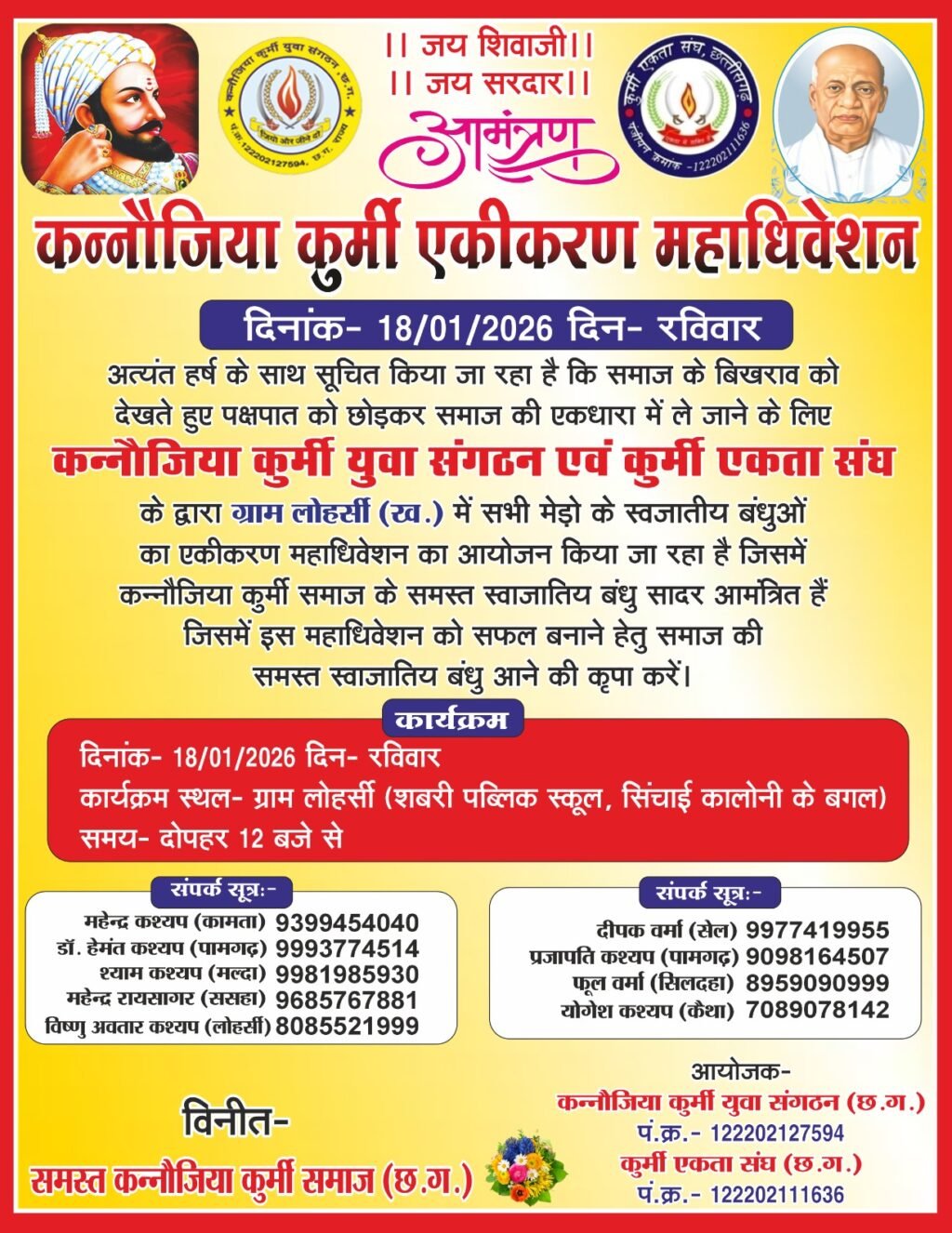 गिधौरी। कन्नौजिया कुर्मी समाज में व्याप्त बिखराव, आपसी मतभेद और विघटन को समाप्त कर सामाजिक एकता को सुदृढ़ करने के उद्देश्य से कन्नौजिया कुर्मी समाज की आम जनता द्वारा कन्नौजिया कुर्मी एकीकरण महाधिवेशन का भव्य आयोजन किया जा रहा है। यह महाधिवेशन 18 जनवरी 2026, रविवार को ग्राम लोहर्सी (खरौद) में आयोजित होगा। आयोजकों के अनुसार यह महाधिवेशन किसी एक संगठन, व्यक्ति या गुट का नहीं, बल्कि समाज की आम जनता का अधिवेशन है। कन्नौजिया कुर्मी युवा संगठन एवं कुर्मी एकता संघ केवल मंच प्रदान कर रहे हैं, जबकि वास्तविक आयोजक समाज के आप और हम स्वयं हैं।