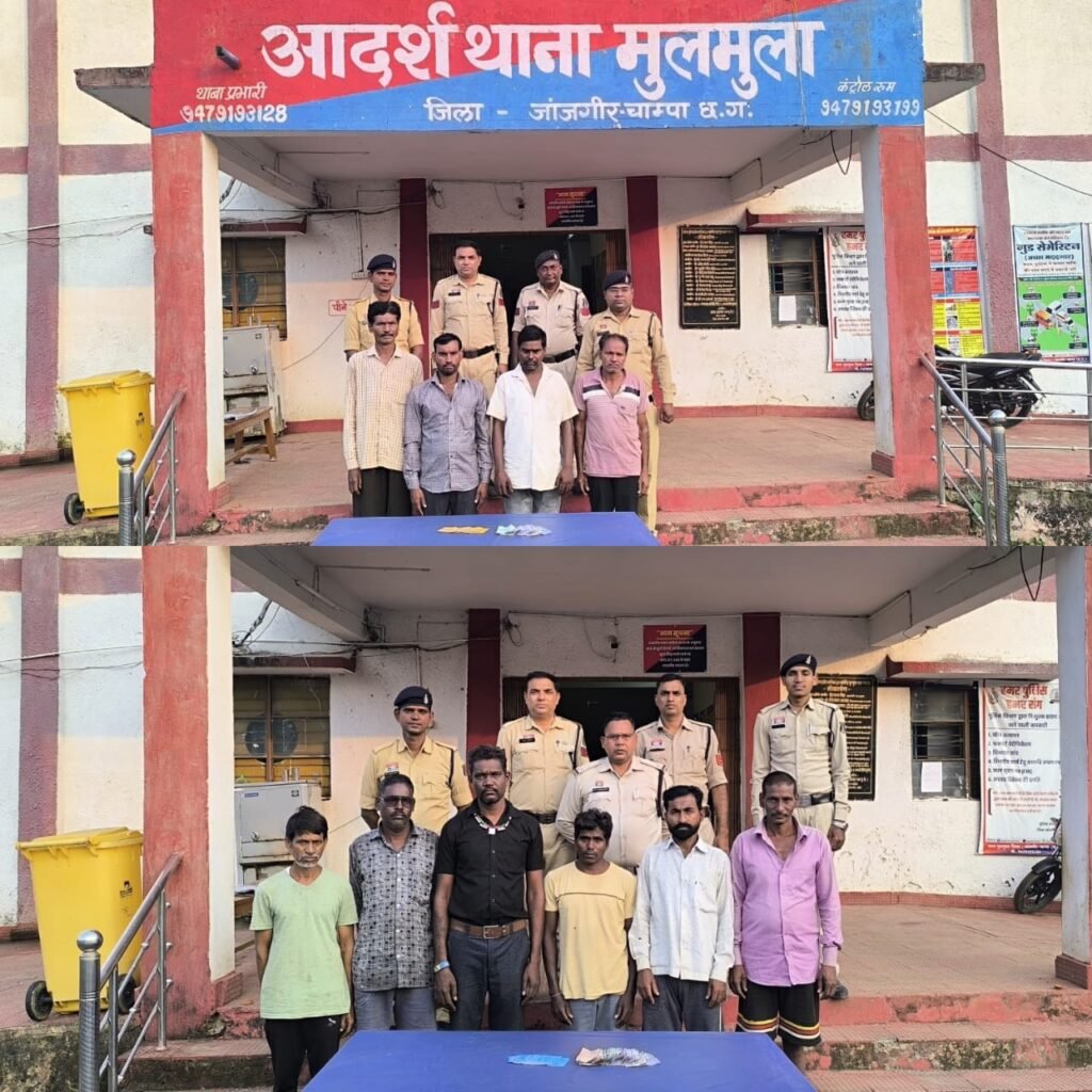 मुलमुला । पुलिस अधीक्षक जांजगीर -चाम्पा विजय कुमार पाण्डेय (IPS) के निर्देशन में तथा अतिरिक्त पुलिस अधीक्षक उमेश कुमार कश्यप के कुशल मार्गदर्शन में जुआ सट्टा पर प्रभावी अंकुश लगाने हेतु पुलिस द्वारा लगातार कार्यवाही की जा रही है कि इसी क्रम में थाना मुलमुला पुलिस द्वारा SDOP अकलतरा प्रदीप कुमार सोरी के नेतृत्व में रेड कार्यवाही कर जुआ खेल रहे 10 जुआडियानों को पकड़ा