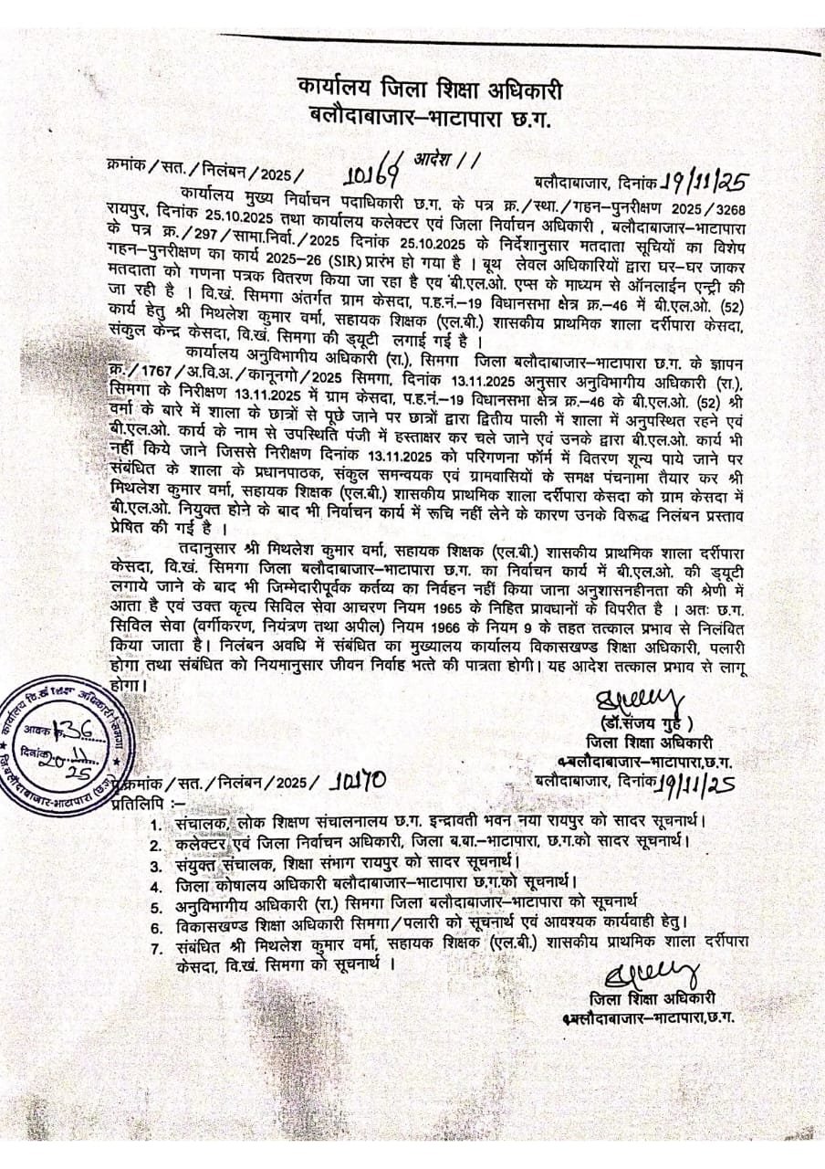 बलौदाबाजार। अनुशासनहीनता क़ो बढ़ावा देने, शराब पीकर विद्यालय आने, शाला समय में अनुपस्थित, निर्वाचन कार्य में बी.एल.ओ. की ड्यूटी लगाये जाने के बाद भी जिम्मेदारीपूर्वक कर्तव्य का निर्वहन नहीं करने सम्बन्धी शिकायत पर कड़ी कार्यवाही करते हुए प्रभारी प्राचार्य एवं दो सहायक शिक्षक क़ो निलंबित कर दिया गया है।