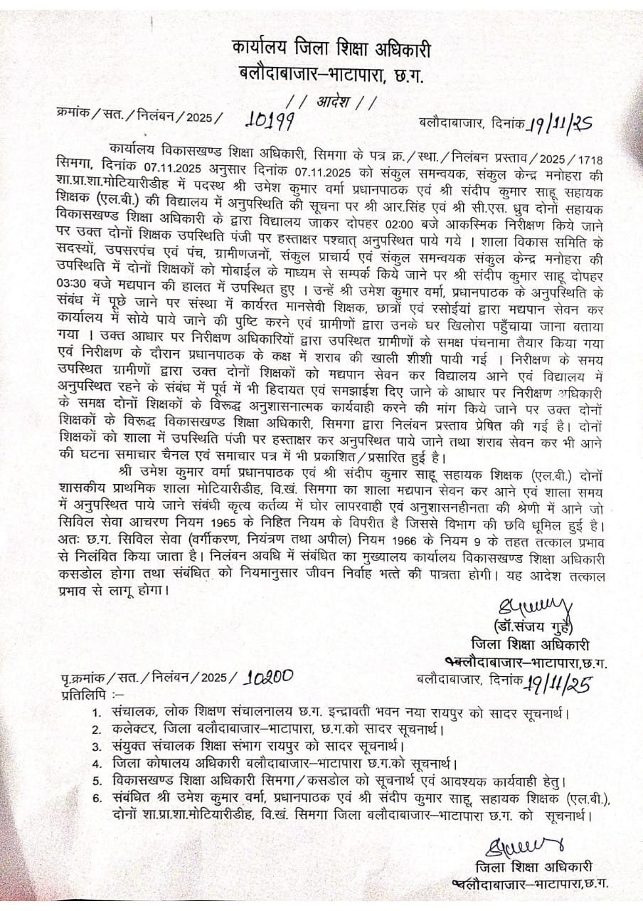 प्राप्त जानकारी विकासखंड सिमगा अंतर्गत शासकीय प्राथमिक शाला मोटियारीडीह में पदस्थ प्रधानपाठक उमेश कुमार वर्मा एवं सहायक शिक्षक (एल.बी.) संदीप कुमार साहू द्वारा मद्यपान कर शाला आने एवं शाला समय में अनुपस्थित पाये गए।इसी तरह विकासखंड सिमगा अंतर्गत शासकीय प्राथमिक शाला दर्रीपारा केसदा में पदस्थ सहायक शिक्षक (एल.बी.) मिथलेश कुमार वर्मा का निर्वाचन कार्य में बी.एल.ओ की ड्यूटी लगाये जाने के बाद भी जिम्मेदारीपूर्वक कर्तव्य का निर्वहन नहीं किया गया।