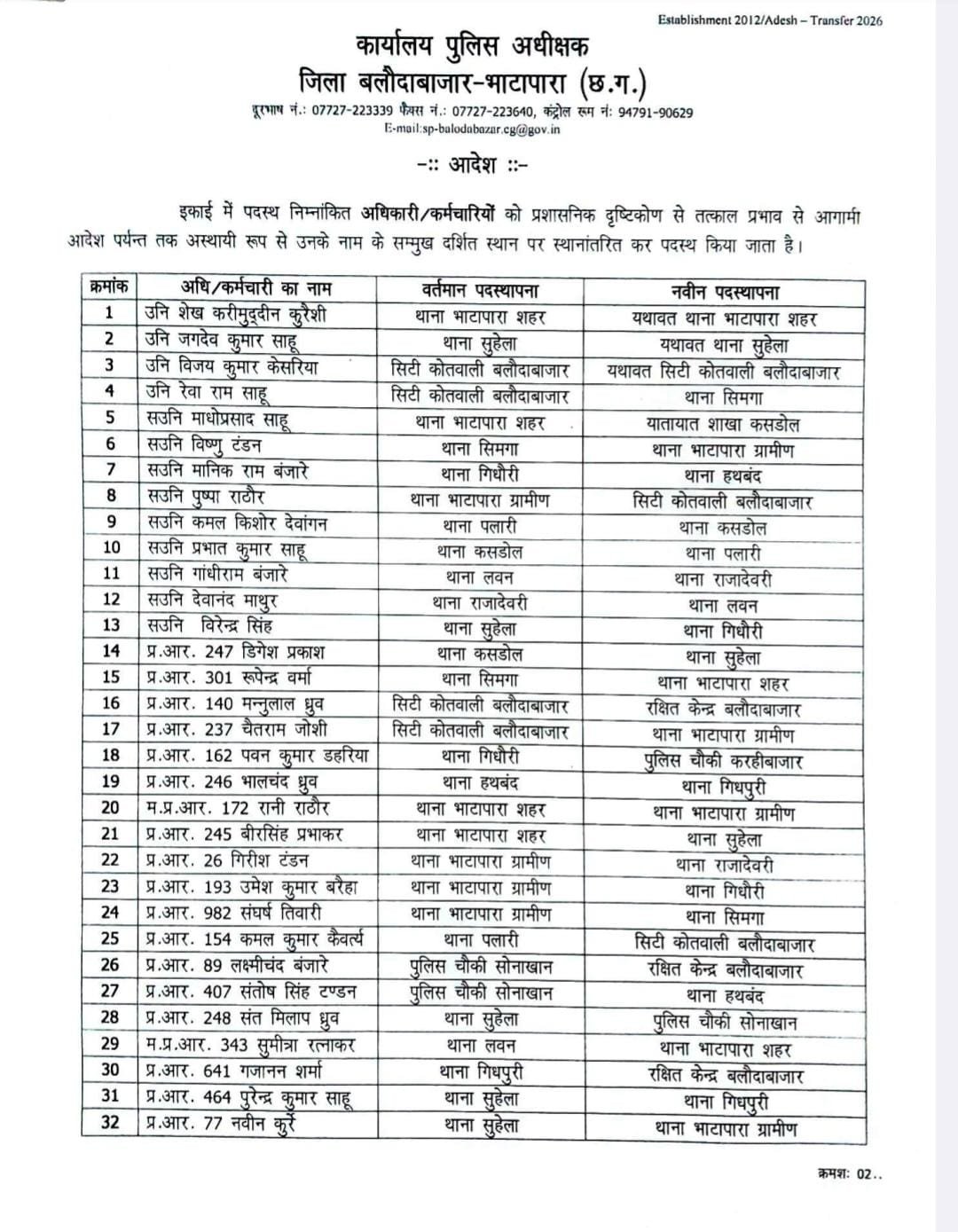 बलौदाबाजार पुलिस महकमे में बड़ा फेरबदल…76 पुलिसकर्मियों के हुए तबादले..देखे लिस्ट