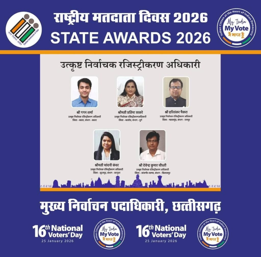 जांजगीर-चांपा / 16 वें राष्ट्रीय मतदाता दिवस 2026 के अवसर पर छत्तीसगढ़ राज्य में आयोजित स्टेट अवार्ड्स 2026 के तहत अनुविभागीय अधिकारी (रा) पामगढ़ श्री देवेंद्र कुमार चौधरी को बिलासपुर संभाग अंतर्गत उत्कृष्ट निर्वाचक रजिस्ट्रीकरण अधिकारी के रूप में राज्य स्तरीय सम्मान से सम्मानित किया गया है। श्री चौधरी को यह सम्मान पामगढ़ विधानसभा क्षेत्र में उत्कृष्ट कार्य करने के लिए प्रदान किया गया है।