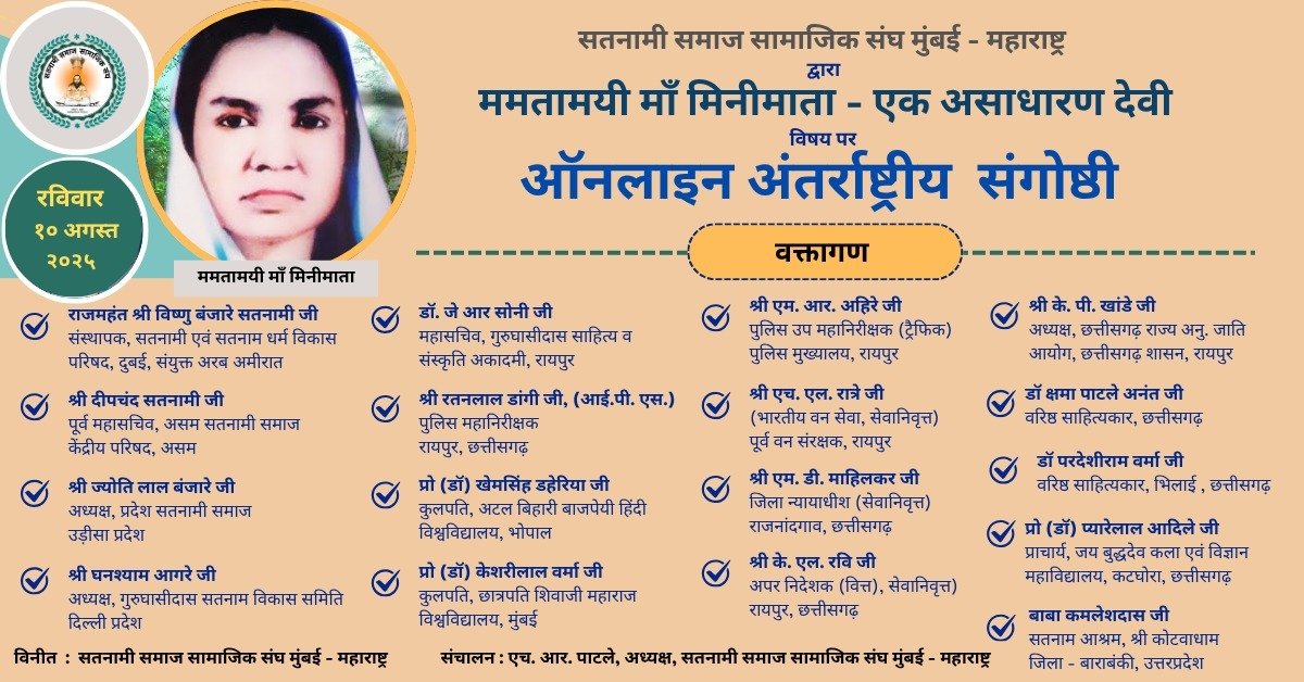 इस ऑनलाइन अंतर्राष्ट्रीय सेमिनार में देश-विदेश से 17 वक्ता वर्चुअल रूप से जुड़कर अपना व्याख्यान देंगे, इनमें प्रमुख हैं राजमहंत विष्णु बंजारे जी (सतनामी एवं सतनाम धर्म विकास परिषद, दुबई, संयुक्त अरब अमीरात), दीपचंद सतनामी जी (पूर्व महासचिव, असम राज्य सतनामी समाज केंद्रीय परिषद), ज्योति लाल बंजारे जी (अध्यक्ष, सतनामी समाज, ओडिशा राज्य), घनश्याम ओगरे जी (अध्यक्ष, गुरु घासीदास सतनाम विकास समिति, दिल्ली राज्य), डॉ. जे.आर. सोनी जी (महासचिव, गुरु घासीदास साहित्य एवं संस्कृति अकादमी, रायपुर), श्री रतनलाल दांगी जी (पुलिस महानिरीक्षक, रायपुर), प्रो (डॉ.) खेम सिंह डेहरिया जी (कुलपति, अटल बिहारी वाजपेयी हिंदी विश्वविद्यालय, भोपाल), प्रो (डॉ.) केसरी लाल वर्मा जी (कुलपति, छत्रपति शिवाजी महाराज विश्वविद्यालय, मुंबई), के.पी. खांडे जी (अध्यक्ष, छत्तीसगढ़ राज्य अनुसूचित जाति आयोग, रायपुर), एम.आर. अहिरे जी (पुलिस उप महानिरीक्षक, यातायात पुलिस मुख्यालय, रायपुर), एच.एल. रात्रे जी (भारतीय वन सेवा, सेवानिवृत्त, पूर्व वन संरक्षक, रायपुर), एम.डी. महिलकर (सेवानिवृत्त जिला न्यायाधीश, राजनांदगांव), के.एल. रवि जी (अपर संचालक, सेवानिवृत्त, वित्त विभाग, छत्तीसगढ़), डॉ. परदेशी राम वर्मा जी (वरिष्ठ साहित्यकार, भिलाई, छत्तीसगढ़), डॉ. क्षमा पाटले जी (वरिष्ठ साहित्यकार, छत्तीसगढ़), प्रो. (डॉ.) प्यारेलाल आदिले जी (प्राचार्य, जय बुद्धदेव कला एवं विज्ञान महाविद्यालय, कटघोरा, जिला कोरबा) के अलावा बाबा कमलेश दास जी (सतनाम आश्रम, कोटवा धाम, जिला बाराबंकी, उत्तर प्रदेश) विशेष रूप से भाग लेंगे। अंतर्राष्ट्रीय संगोष्ठी की जानकारी देते हुए सतनामी समाज सामाजिक संघ, मुंबई, महाराष्ट्र के अध्यक्ष एच.आर. पाटले ने बताया कि सभी वक्ता *ममतामयी मिनीमाता : एक असाधारण देवी* ‘ विषय पर अपने विचार प्रस्तुत करेंगे और श्री पाटले ने बताया कि प्रत्येक वक्ता को अपने विचार प्रस्तुत करने के लिए अधिकतम 10 मिनट का समय दिया जाएगा। इस अंतर्राष्ट्रीय संगोष्ठी का संचालन छत्तीसगढ़ रहवासी संघ मुंबई के अध्यक्ष एच.आर. पाटले जी करेंगे। यह जानकारी नीलकमल आजाद ने दी