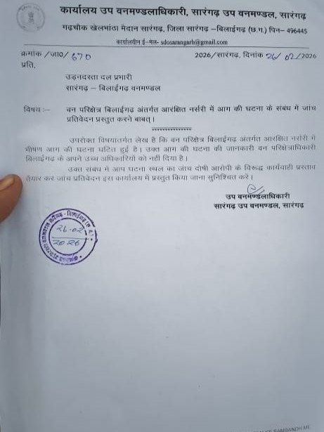 सारंगढ़ – छत्तीसगढ़ के सारंगढ़ बिलाईगढ़ जिले के बिलाईगढ़ वन परिक्षेत्र अंतर्गत आरक्षित नर्सरी रेल कॉरिडोर कक्ष क्रमांक 408 में भीषण आगजनी होने की वजह से करीब 42000 पेड़ को नुकसान पहुंचा है जिसमें बड़ी संख्या में सागौन पेड़ और फलदार पेड़ शामिल हैं। उक्त खबर मिलने के बाद उप वनमंडल अधिकारी सारंगढ़ बिलाईगढ़ के द्वारा उड़नदस्ता दल प्रभारी को गुरुवार को आदेश जारी करते हुए पत्र लिखा गया है कि बिलाईगढ़ के आरक्षित नर्सरी में भी सड़क की घटना घटित हुई है उक्त आग की घटना की जानकारी वन परिक्षेत्र अधिकारी बिलाईगढ़ के द्वारा अपने उच्च अधिकारियों को नहीं दिया गया है उक्त संबंध में आप घटनास्थल पर जांच कर दोषी आरोपी के विरुद्ध कार्यवाही प्रस्ताव तैयार कर जांच प्रतिवेदन कार्यालय में प्रस्तुत करना सुनिश्चित करें।