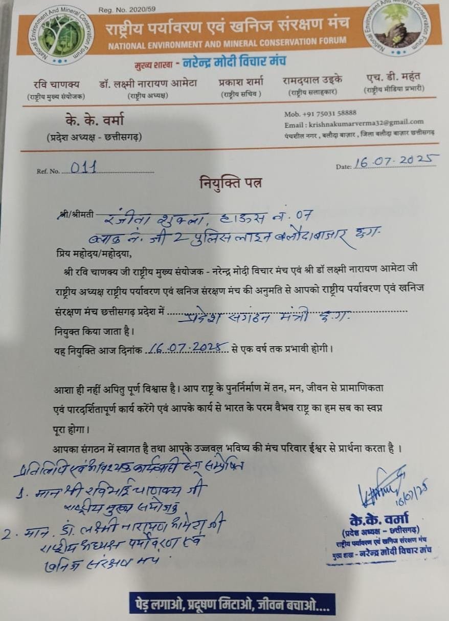 रंजीता शुक्ला बनी राष्ट्रीय पर्यावरण एवं खनिज संरक्षण मंच की प्रदेश संगठन मंत्री