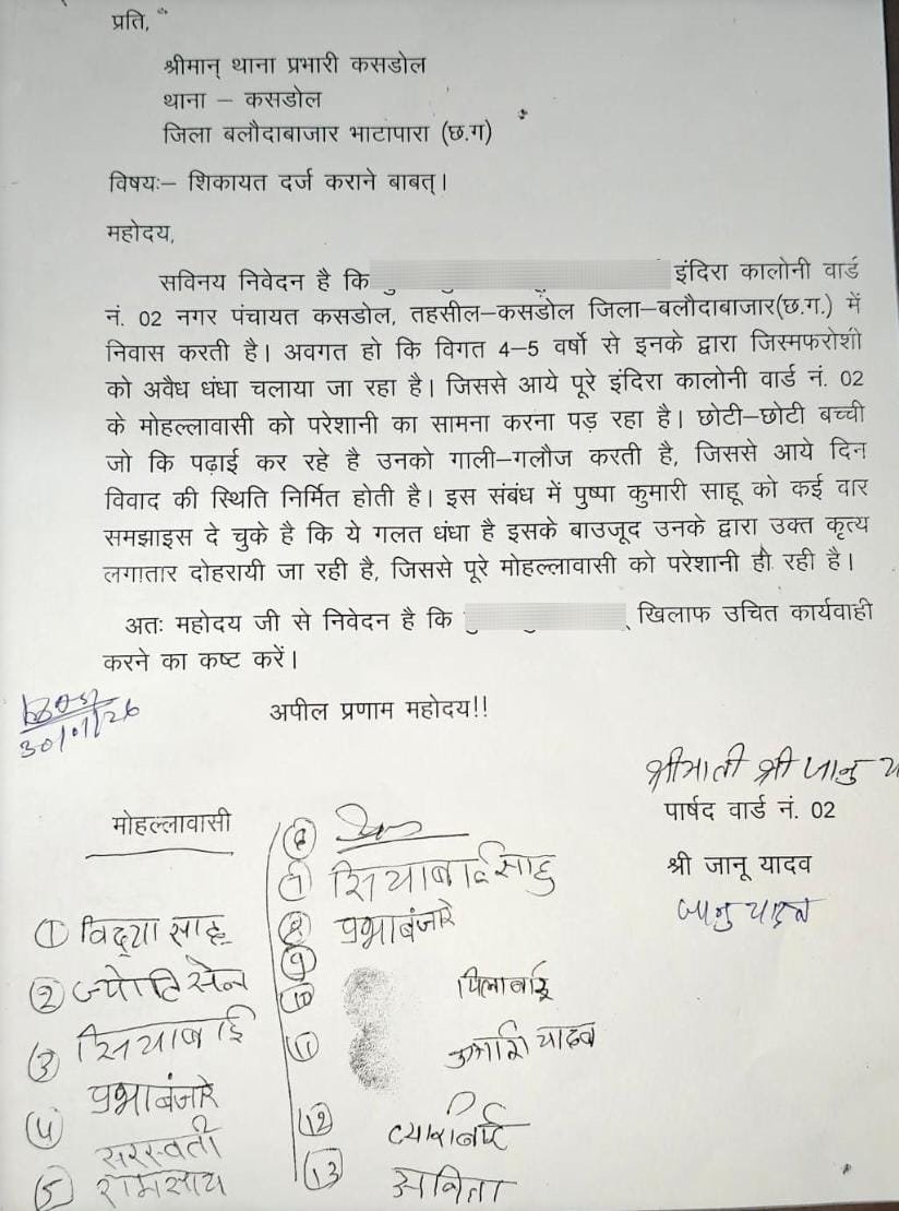 कसडोल। नगर के इंदिरा कॉलोनी वार्ड नं-02 में काफी लंबे समय से संचालित अवैध कारोबार को लेकर वार्डवासी लामबंद नजर आ रहें है, मिली जानकारी के अनुसार शुक्रवार की देर रात्रि थाना प्रभारी कसडोल को दिए शिकायत पत्र के अनुसार वार्डवासियों ने बताया कि इंदिरा कालोनी कसडोल के वार्ड नं. 02 में रह रही अधेड़ महिला के द्वारा विगत 4 वर्षो से अधिक समय से जिस्मफरोशी का अवैध धंधा चलाया जा रहा है।