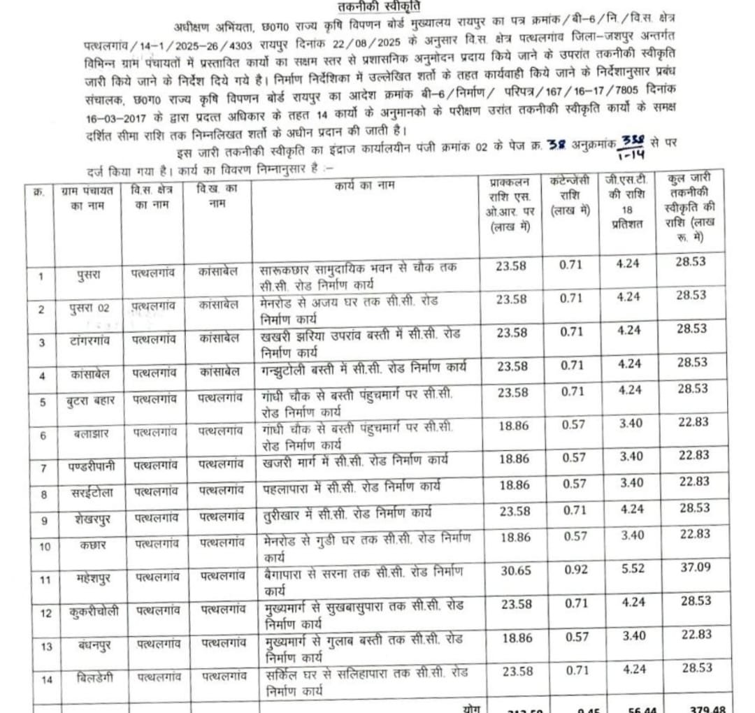 सालिक साय के अनुमोदन से 379 लाख की लागत से होंगे सड़क निर्माण कार्य 14 से अधिक गांवों में सीसी रोड निर्माण कार्यों को मिली स्वीकृति