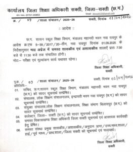 इस संबंध में आदेश की प्रतिलिपि सचिव, स्कूल शिक्षा विभाग, लोक शिक्षण संचालनालय, कलेक्टर सक्ती, जिला शिक्षा अधिकारी सहित सभी संबंधित अधिकारियों एवं विद्यालय प्रमुखों को भेज दी गई है, ताकि निर्देशों का पालन सुनिश्चित किया जा सके।