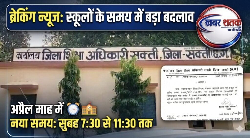 सक्ती । जिला शिक्षा अधिकारी, सक्ती द्वारा जारी आदेश के अनुसार अप्रैल माह में जिले की समस्त शासकीय एवं अशासकीय स्कूलों के संचालन समय में बदलाव किया गया है। आदेश के मुताबिक अब सभी स्कूल सुबह 7:30 बजे से 11:30 बजे तक संचालित किए जाएंगे।