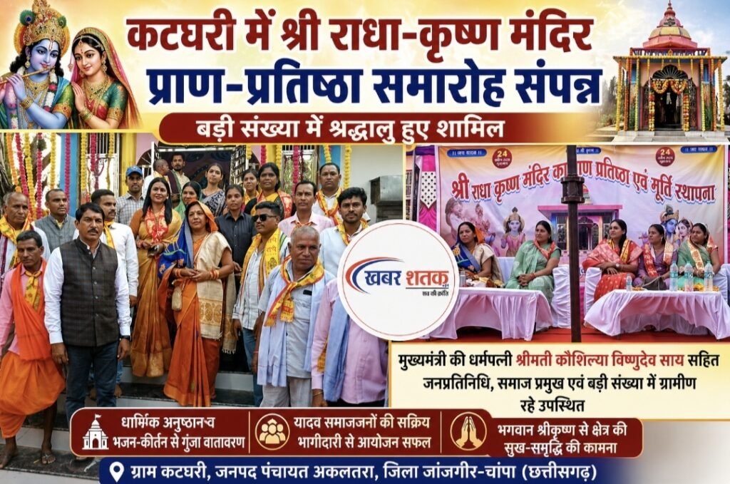 जांजगीर-चांपा | ग्राम कटघरी, जनपद पंचायत अकलतरा जिला जांजगीर-चांपा, छत्तीसगढ़ में श्री राधा-कृष्ण मंदिर के प्राण-प्रतिष्ठा समारोह का भव्य आयोजन किया गया। इस पावन अवसर पर क्षेत्र के जनप्रतिनिधि, समाज प्रमुख एवं बड़ी संख्या में ग्रामीण श्रद्धालु उपस्थित रहे।