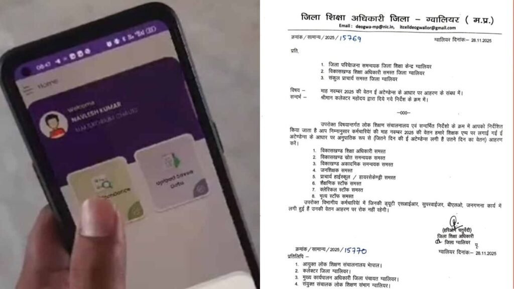 MP News: मध्य प्रदेश के ग्वालियर में अब टीचर्स को ई-अटेंडेंस के आधार पर ही सैलरी मिलेगी. कलेक्टर के निर्देश पर जिला शिक्षा अधिकारी(DEO) हरिओम चतुर्वेदी ने आदेश जारी किया है. अपने आदेश में डीईओ ने साफ तौर पर कहा है कि ई-अटेंडेंस के आधार पर नवंबर महीने की सैलरी दी जाएगी. डीईओ ने जिले के सभी डीपीसी, बीईओ और संकुल प्राचार्यों को आदेश जारी किया है.