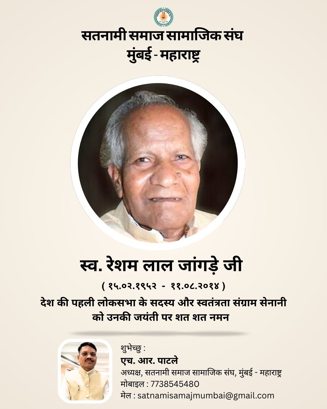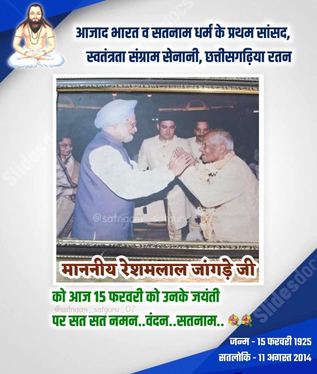 रायपुर। अविभाजित मध्य प्रदेश छत्तीसगढ़ से सात बार के सांसद रहें देश के अन्तरिम सरकार में मनोनीत सांसद सदस्य, स्वतंत्रता सेनानी सतनामी समाज के प्रथम अधिवक्ता समाज सुधारक, अस्पृश्यता निवारण बिल के ड्राफ्टिंग कमेटी के सदस्य स्व रेशमलाल जांगड़े जी को जन्म जयंती पर कोटि कोटि नमन विनम्र श्रद्धांजलि। कहीं हम अपने समाज के गौरवशाली इतिहास एवं व्यक्तित्व को भूल न जाएं।।कृतक्ष छत्तीसगढ़ प्रदेश एवं समाज जयंती पर नमन करते हुए श्रद्धांजलि अर्पित करते हैं।