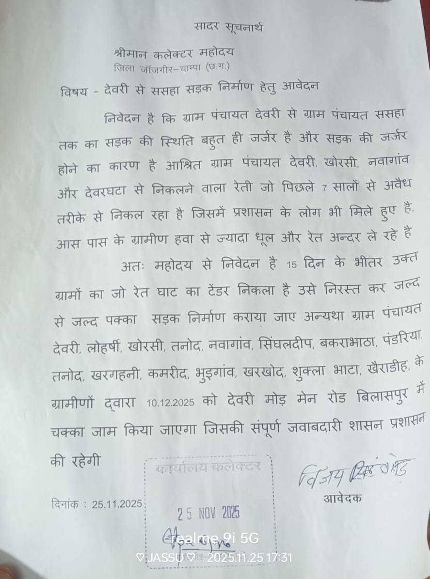 जांजगीर-चांपा । पामगढ़ विधानसभा के अंतर्गत आने वाले देवरी, खोरसी, तनौद, कमरीद,भुईगांव, लोहर्सी, नवागांव, सिंघलद्वीप, भखराभांठ, पड़रिया, ससहा सहित दर्जनों ग्राम पंचायतों के ग्रामीणों और नवयुवकों ने जिला कलेक्टर, जांजगीर-चांपा को ज्ञापन सौंपा गया। इस ज्ञापन में मुख्य रूप से दो मांगें उठाई गई है, देवरी से ससहा तक जर्जर सड़क का स्थायी निर्माण किया जाए रेत परिवहन कर रहे वाहनों को तत्काल बंद कराया जाए।